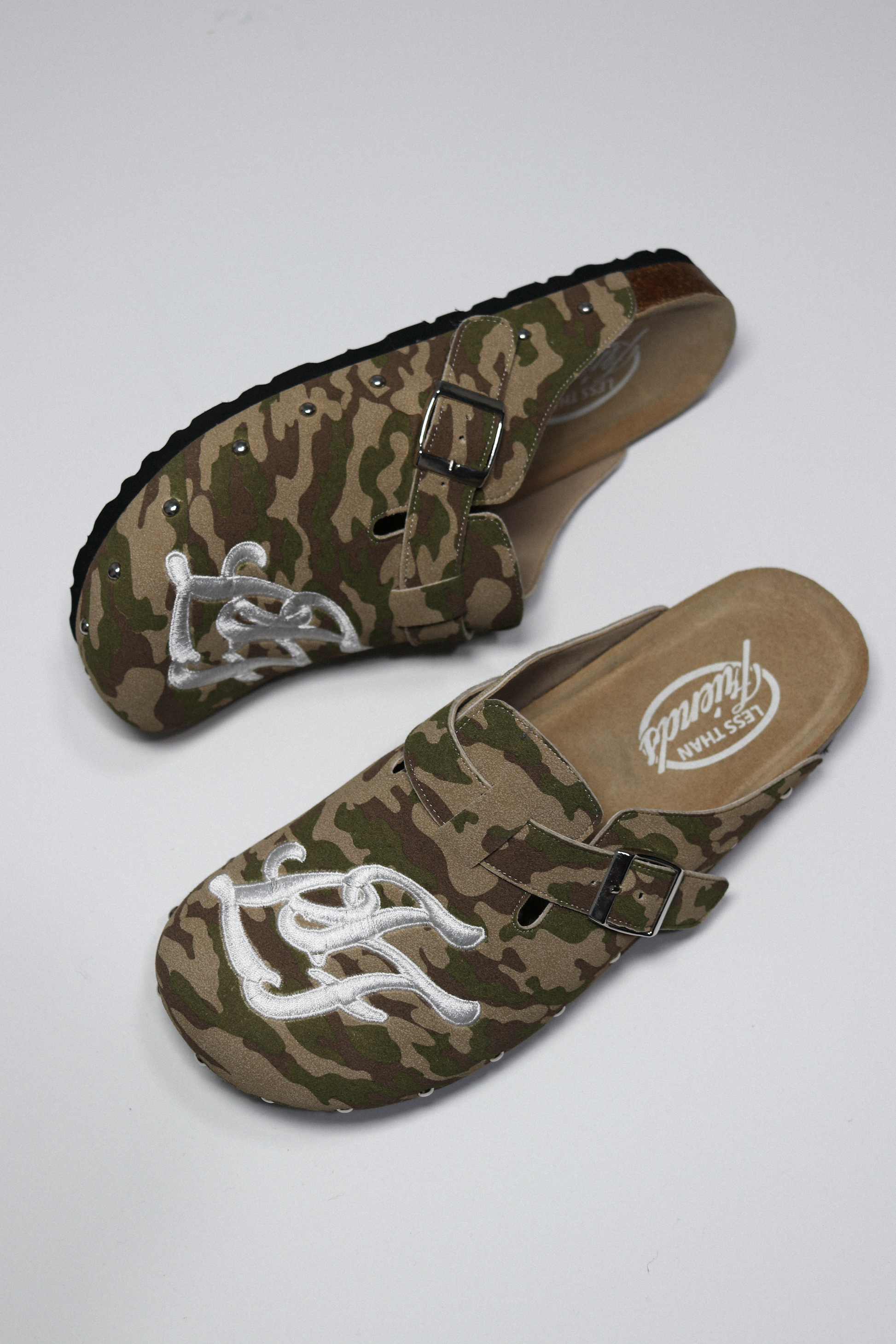 For our return - The standard mule is reimagined through a contemporary lens, balancing refined craftsmanship with effortless wear. The LTF Camo Mule features a leather upper embroidered with the signature LTF logo, set atop a sheepskin suede midsole and EVA cushion sole for adaptive comfort. Finished with a smooth vegan(PU) lining easily making the mules a statement piece